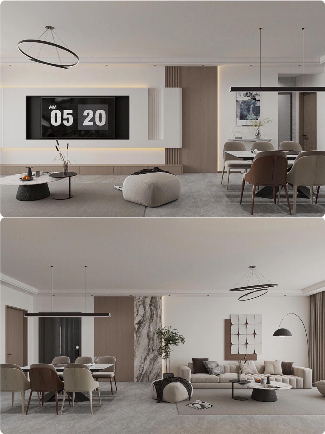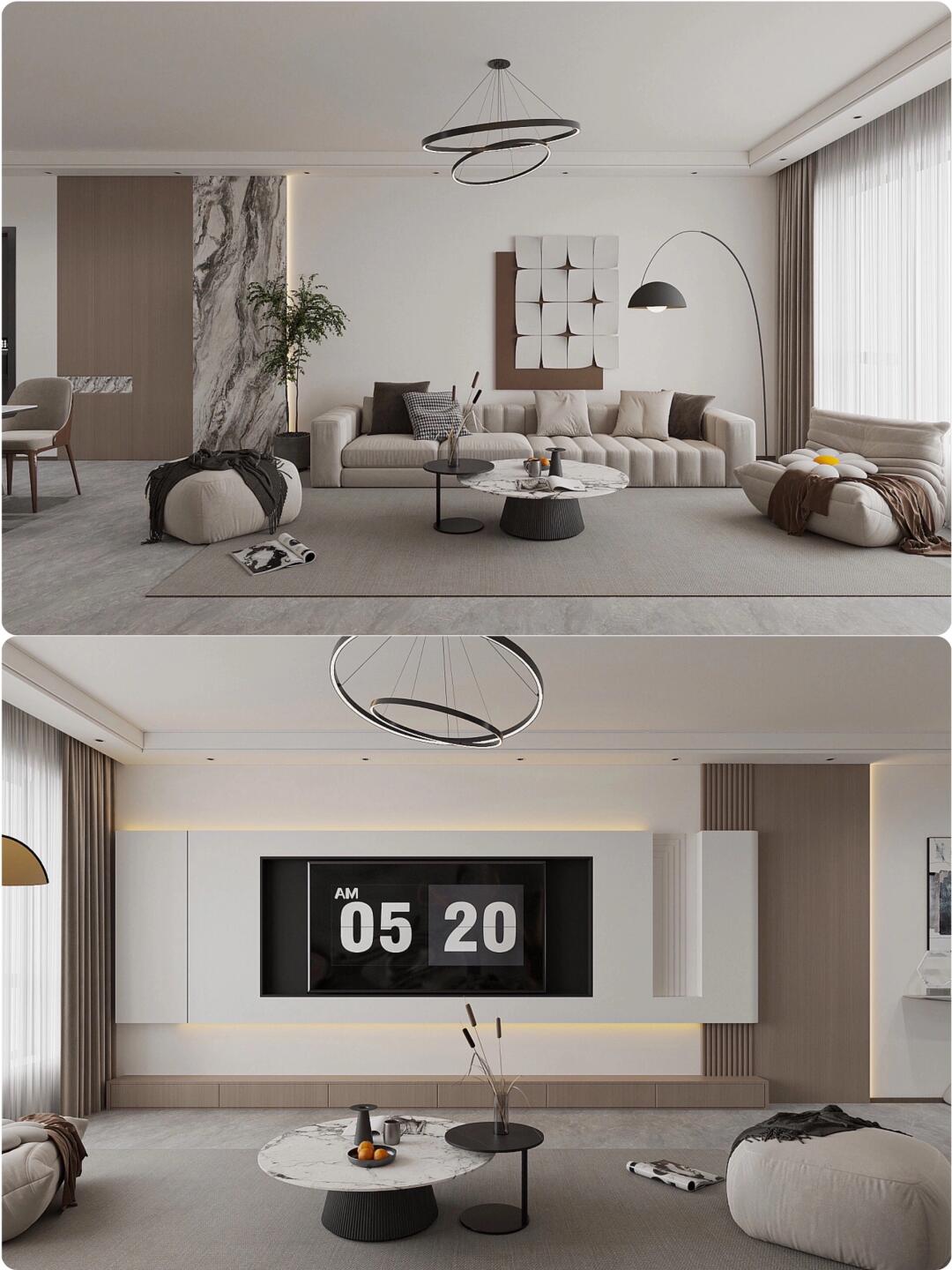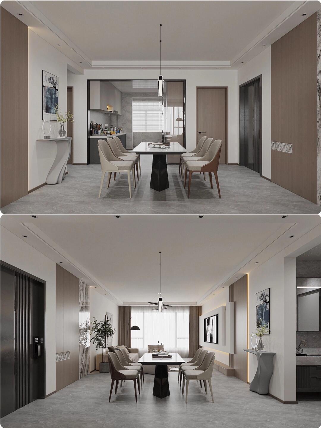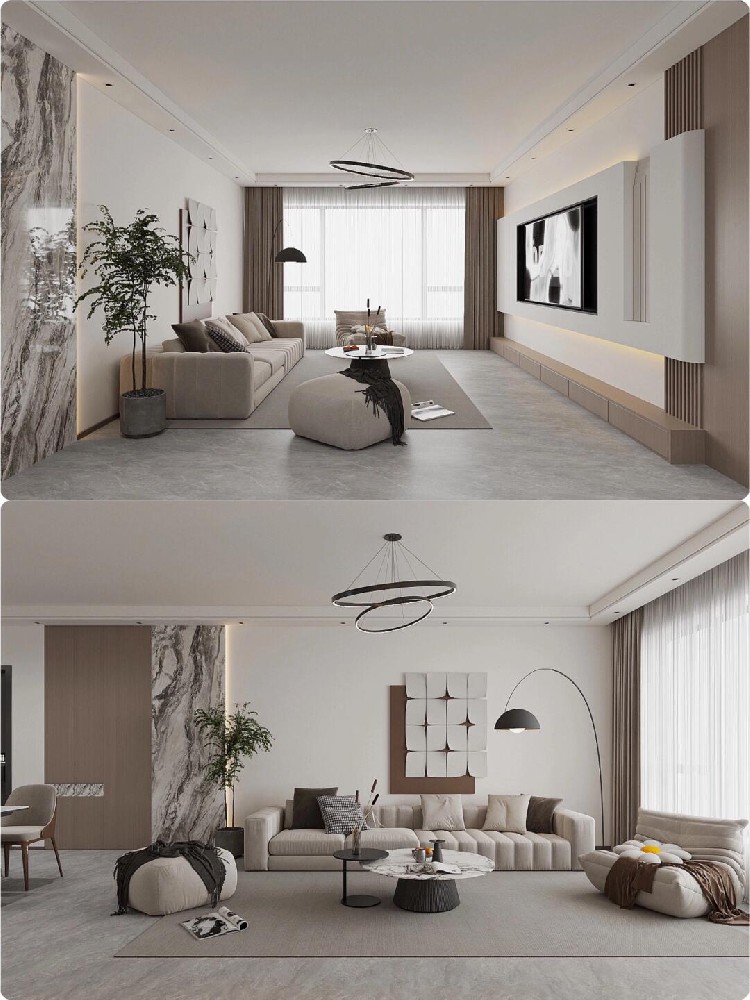 沙發背景墻連接玄關柜,用巖板分隔區域,質感與造型設計優化空間視覺感!