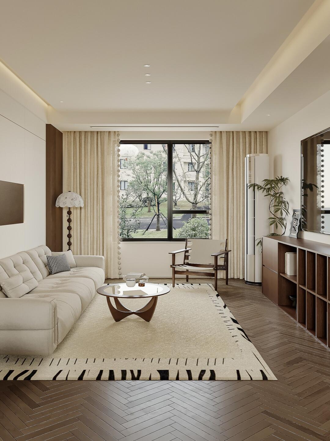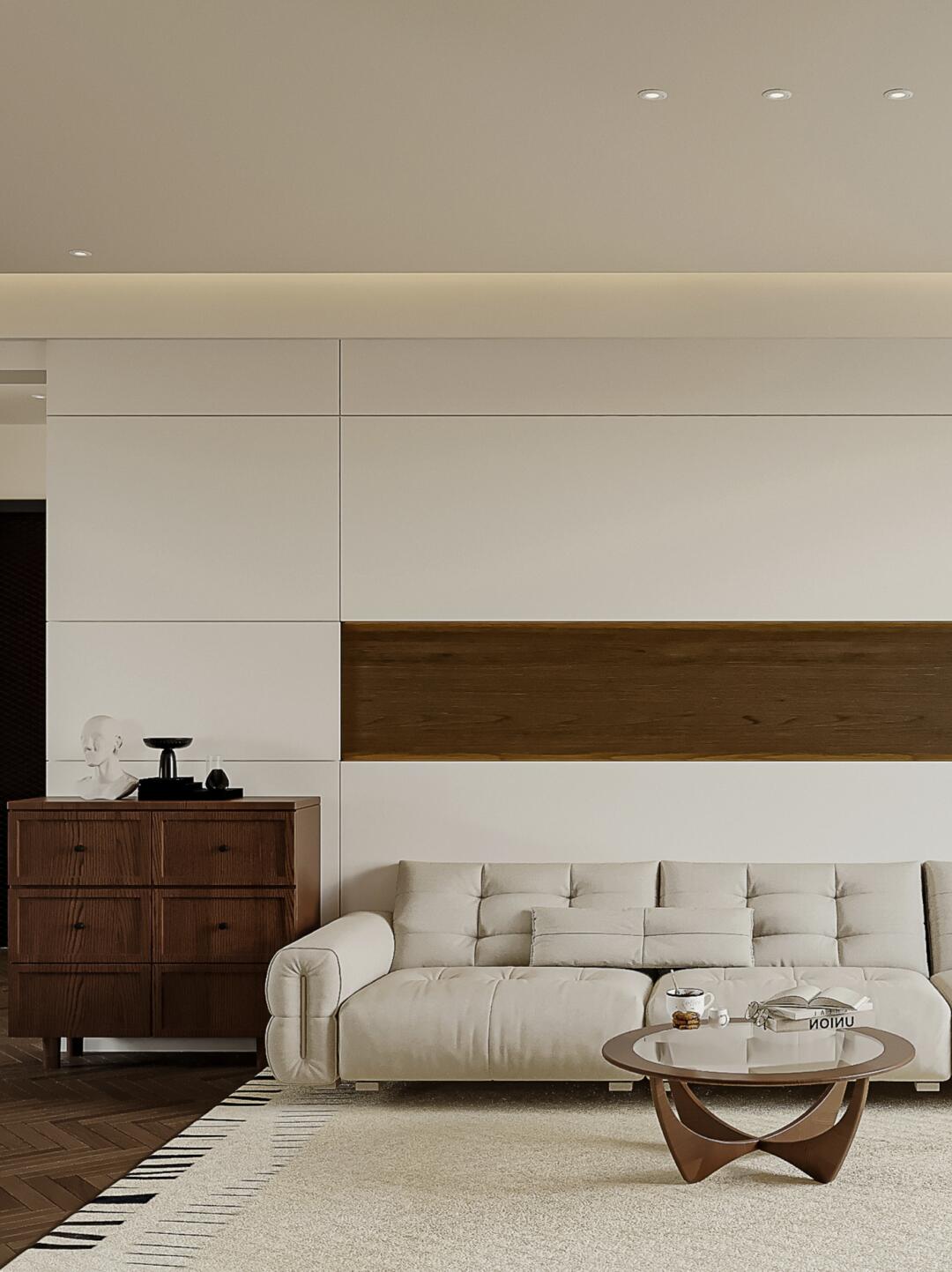留白的沙發(fā)背景墻+木飾裝飾面,豐富視覺效果,使整個(gè)空間更加溫潤靜謐。