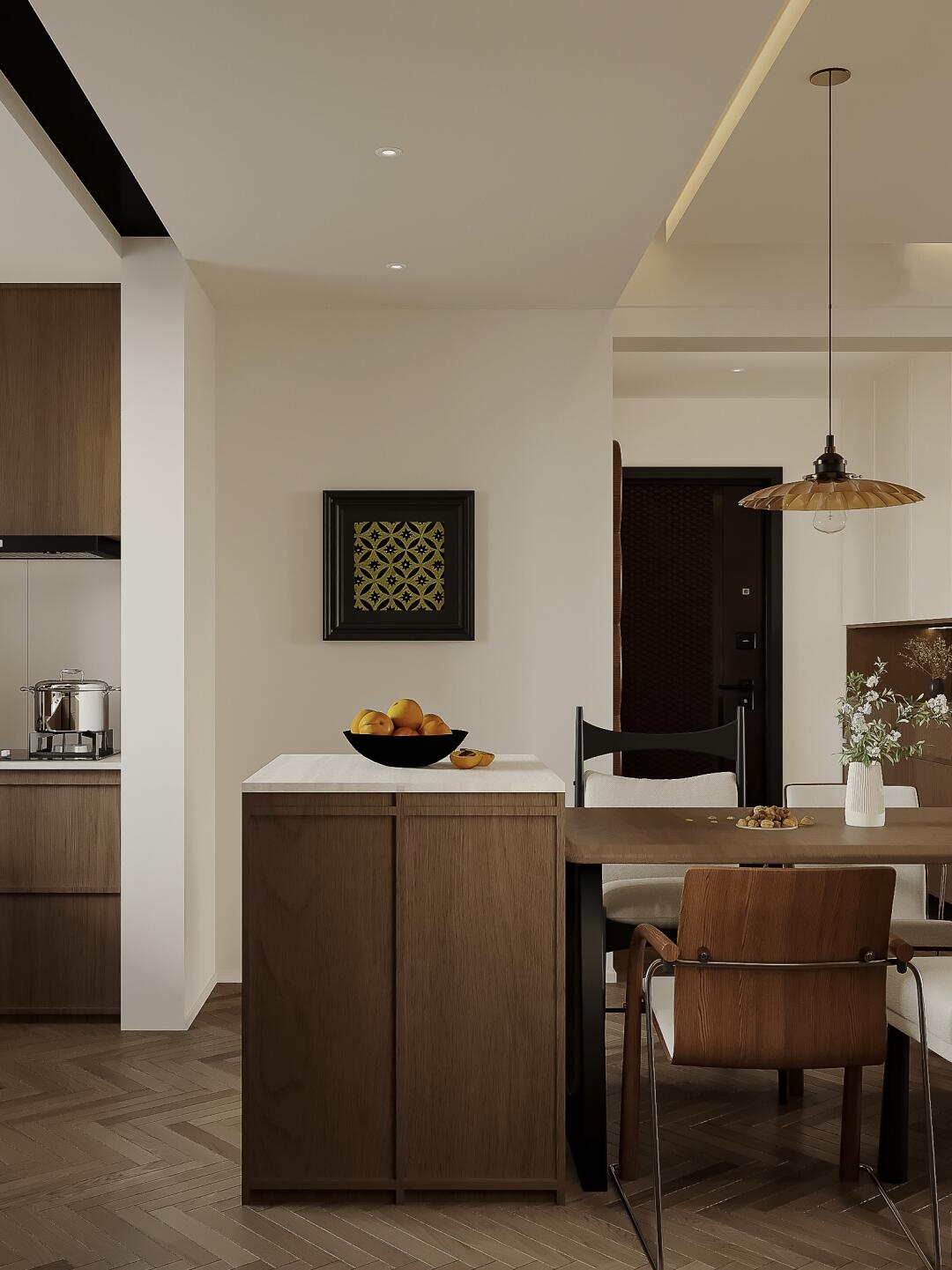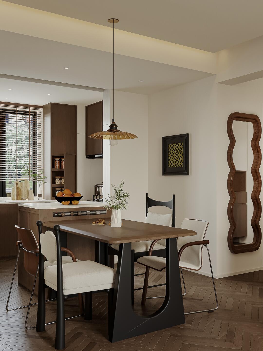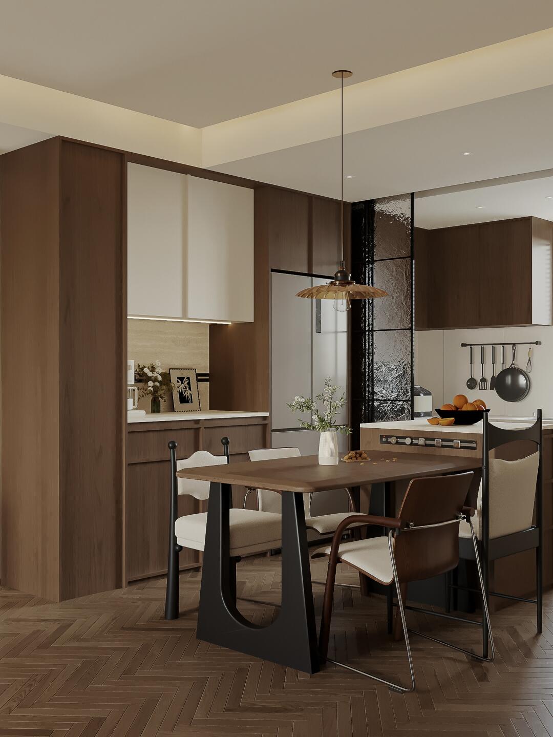 餐廳復(fù)古胡桃木色+黑色,配以淺色柔和藝術(shù)漆,視覺舒適度up!!!中古氛圍感滿滿~