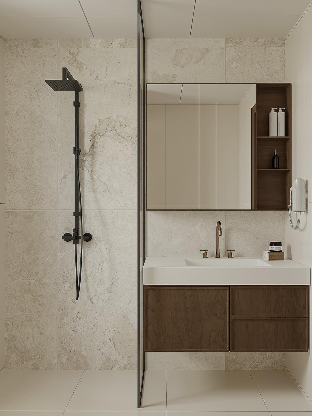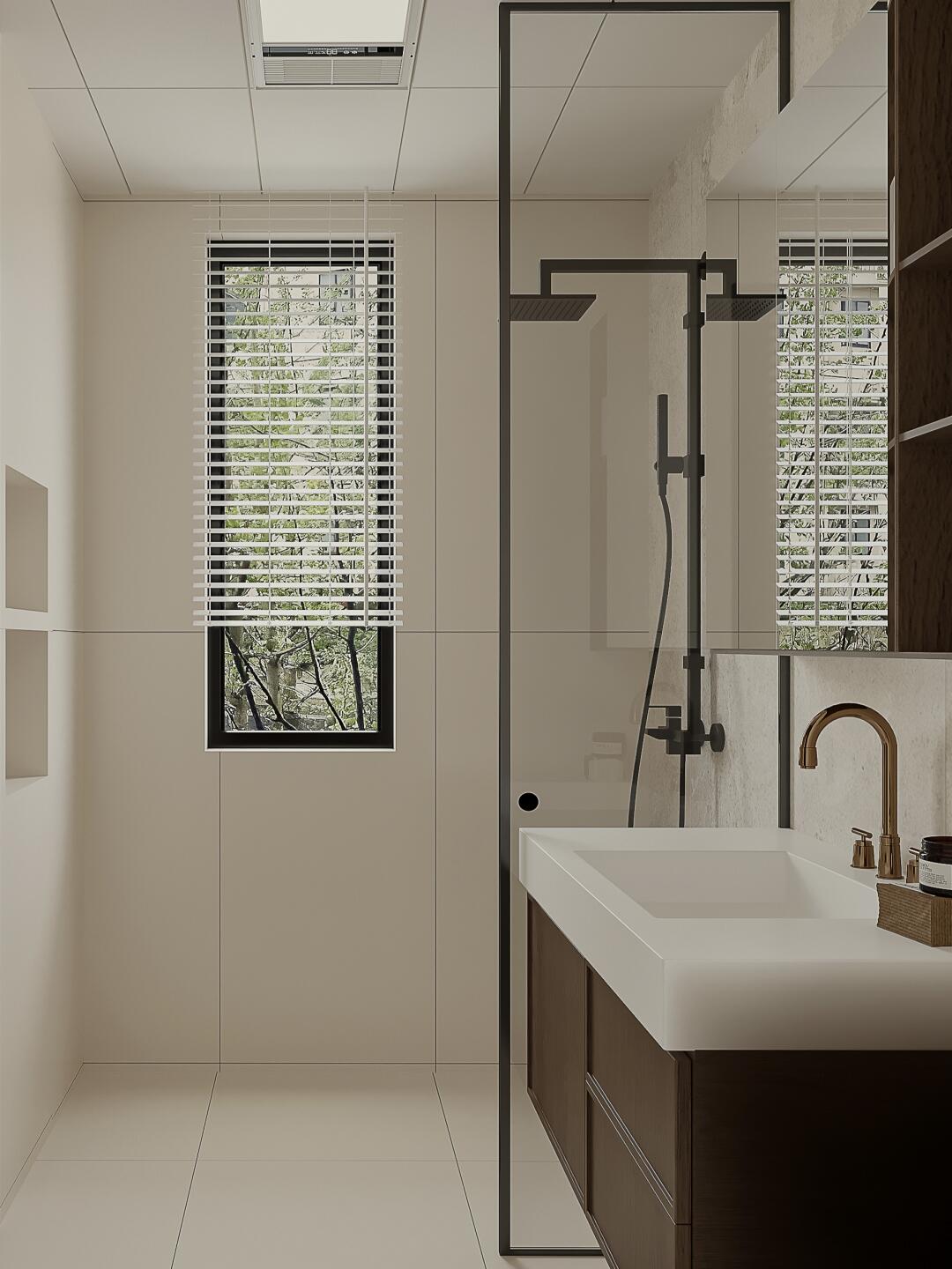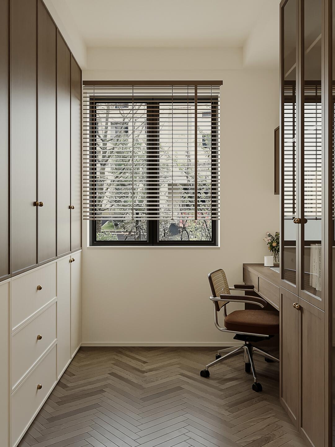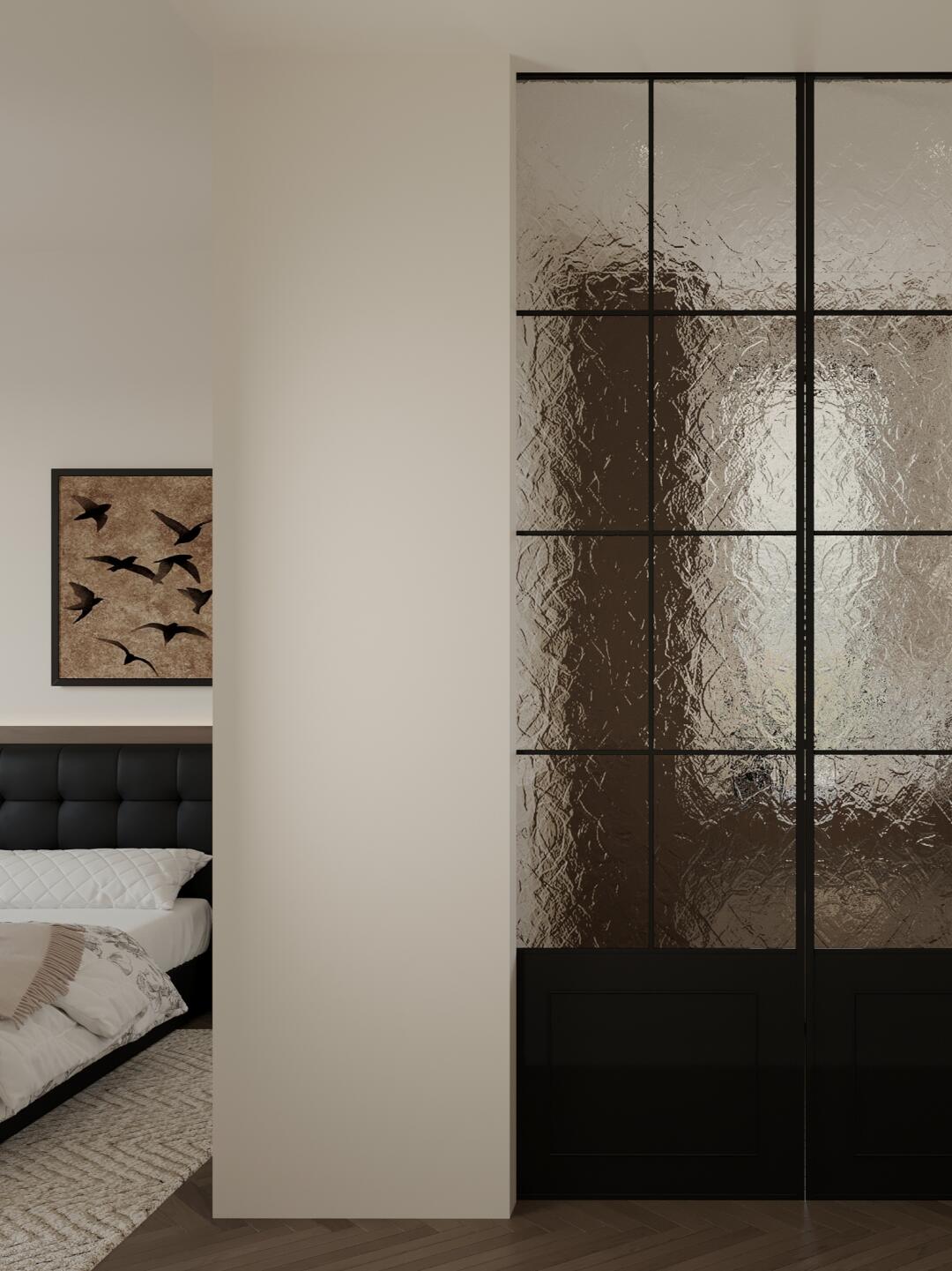 主臥衣帽間選擇復(fù)古玻璃推拉門,打破封閉感,增加空間流動(dòng)性,更加開闊、明亮。