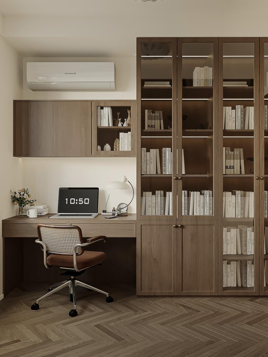 靠窗一側(cè)做書桌+書柜,滿足日常辦公和閱讀需求;