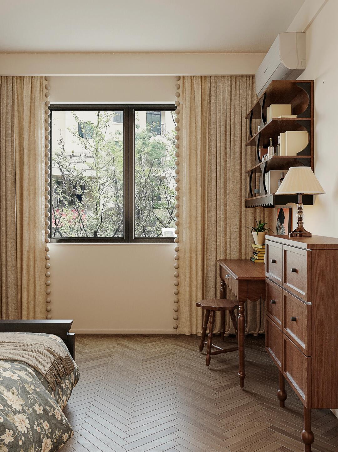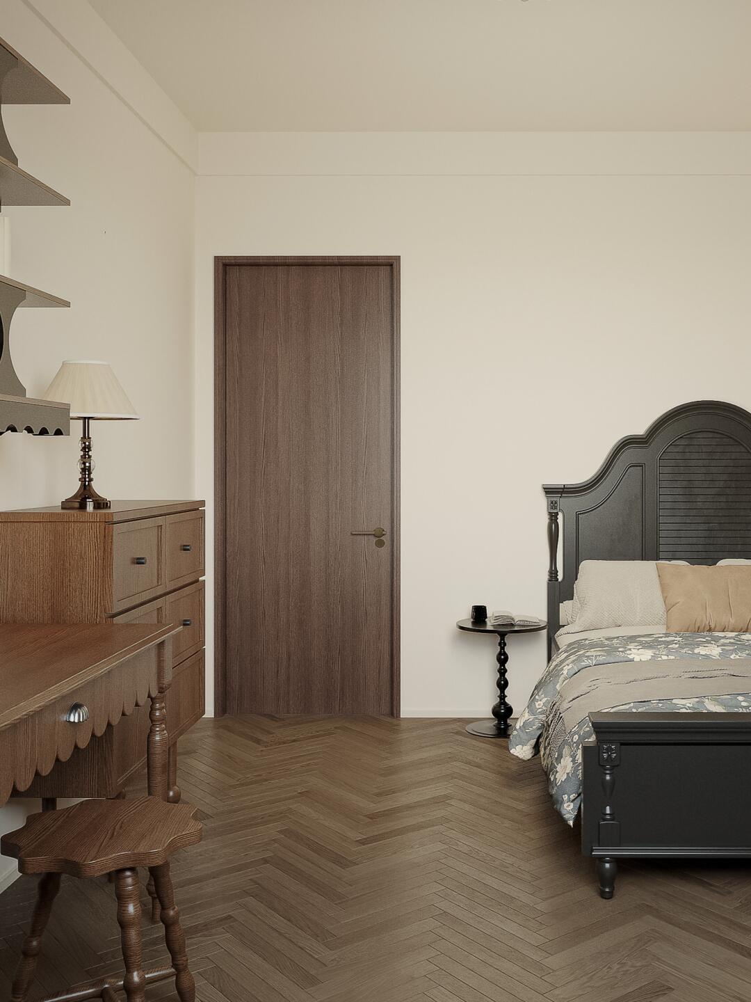 臥室做奶油色墻面,溫柔包裹整個(gè)空間,打造舒適靜謐的居住環(huán)境。棕色半墻床頭背景,層次分明,同時(shí)又增加了空間的復(fù)古氛圍。