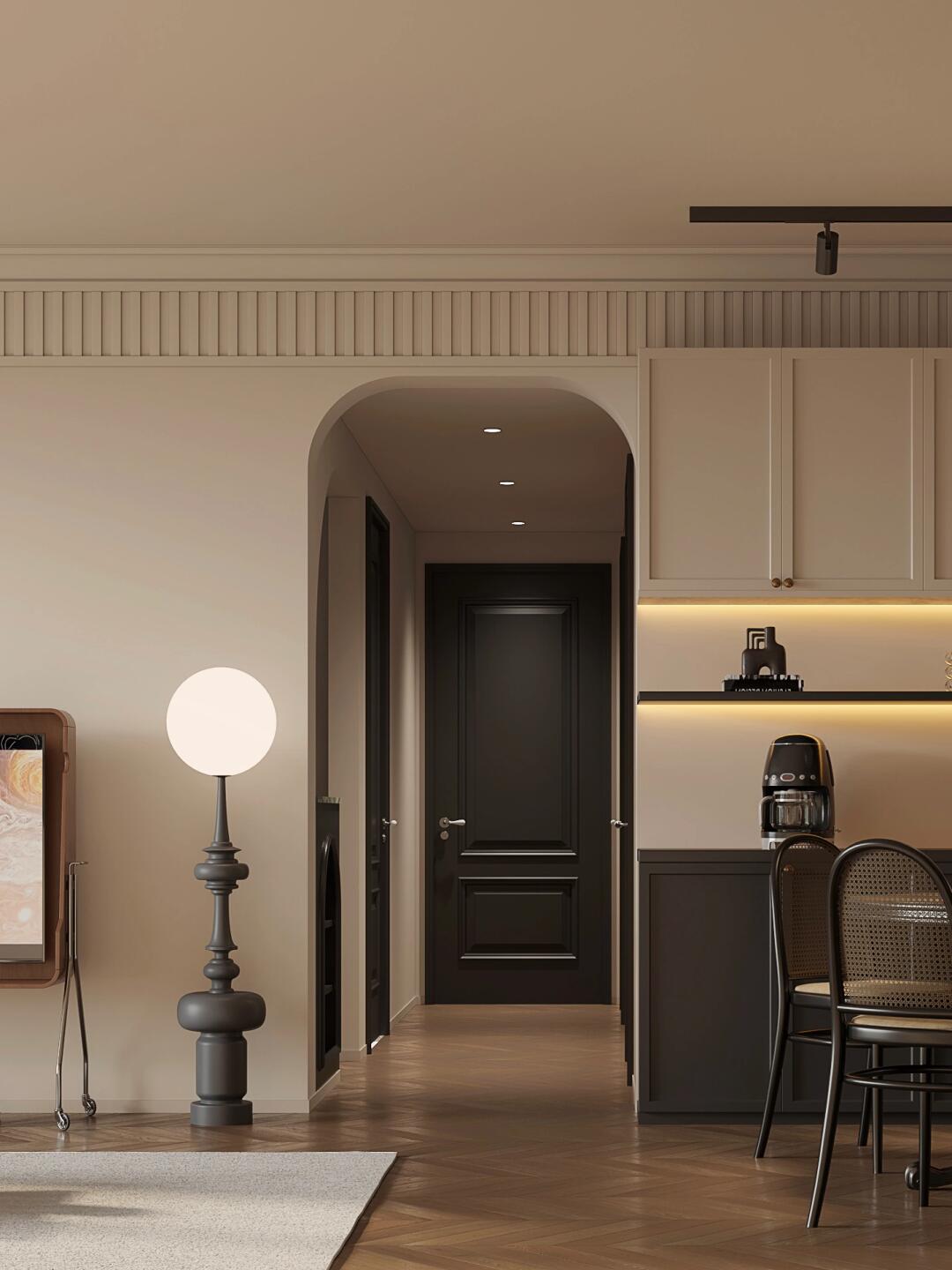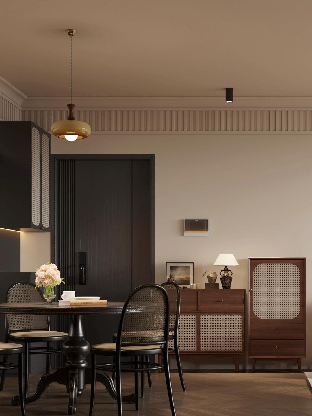 軟裝及主材以胡桃木色和黑色為主,餐廳和廚房相連,合二為一 也可合一為二,