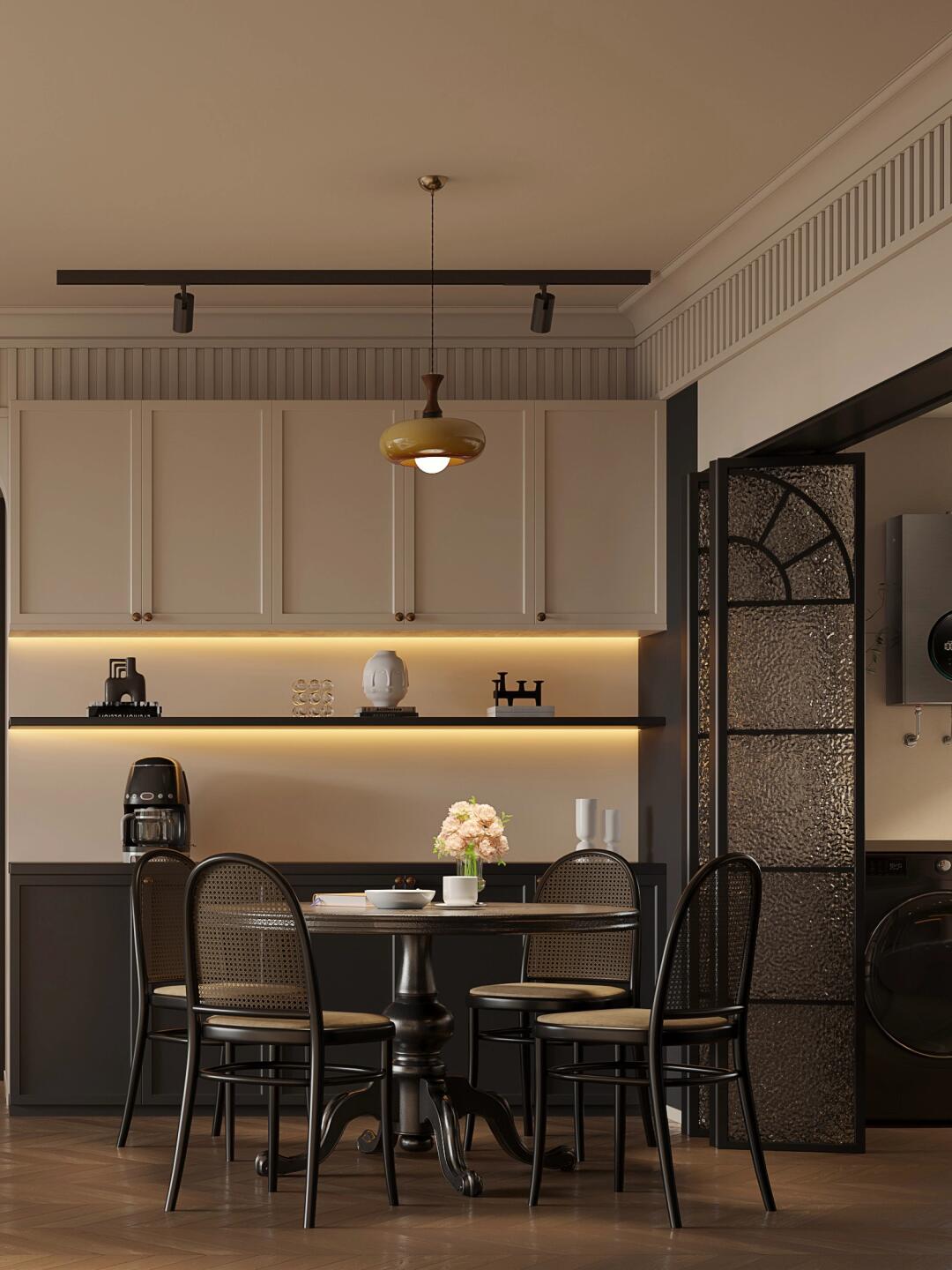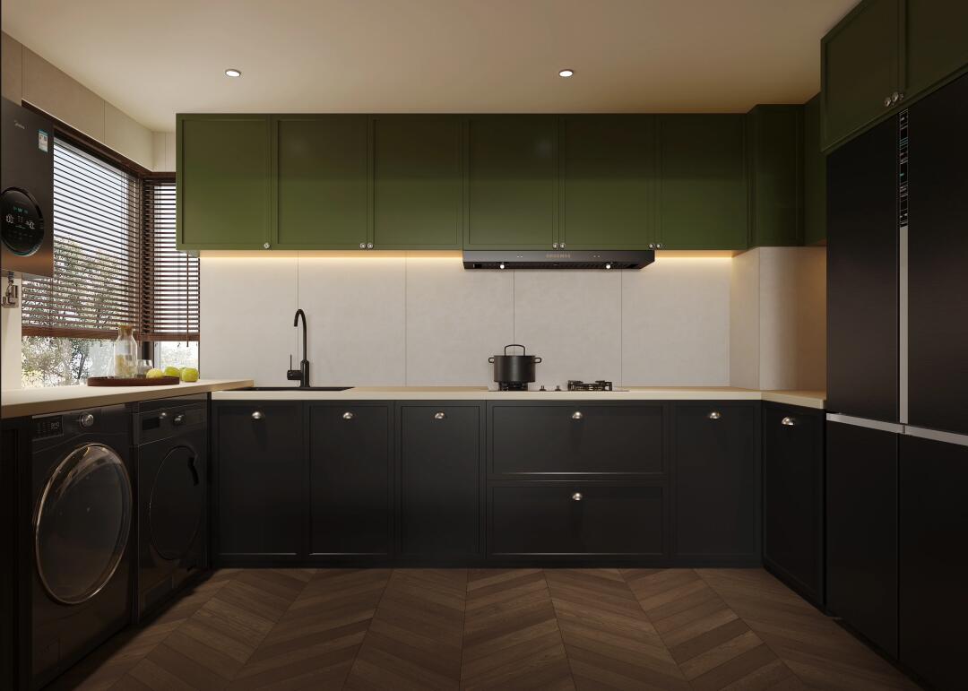 廚房采用復(fù)古黑框玻璃折疊門搭配墨綠色櫥柜和柔光微水泥磚。