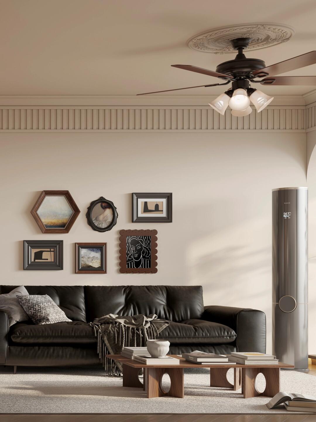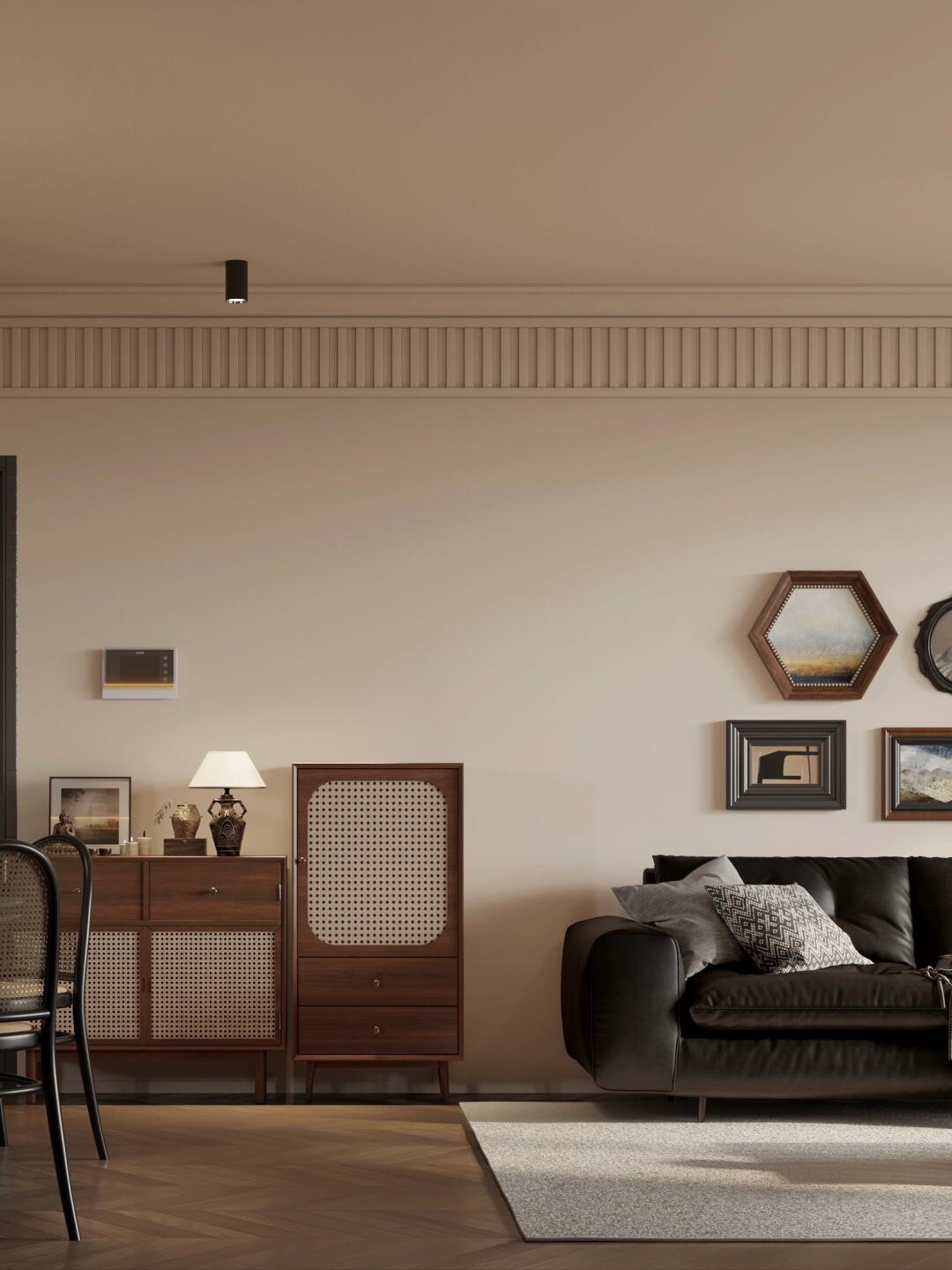 全屋通鋪魚骨紋木紋磚和咖色系墻面搭配,奠定了整個(gè)空間的基調(diào)。