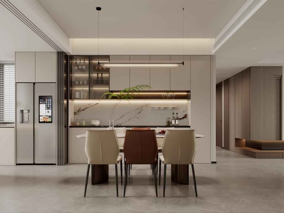 一盞吊燈溫柔灑落,晚餐時光都變得格外溫馨浪漫。 桌上的綠植裝飾,更是為這簡約空間增添了幾分生機。