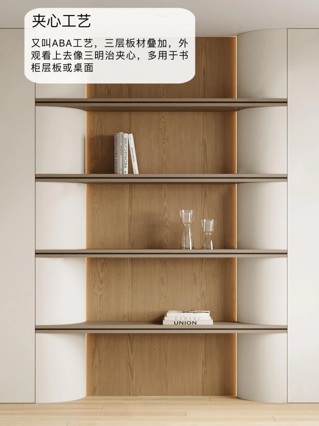 又叫ABA工藝,三層板材疊加,外觀看上去像三明治夾心,多用于書柜層板或桌面。