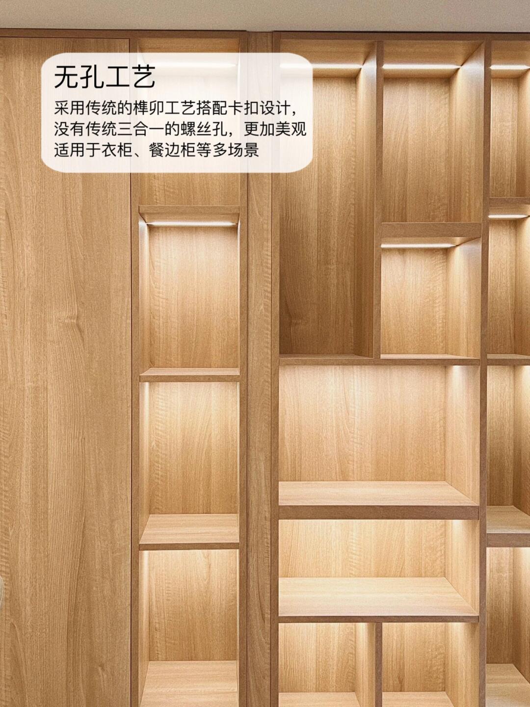 采用傳統榫卯工藝搭配卡扣設計,沒有傳統三合一螺絲孔,更加美觀、方便清潔,適用于衣柜、餐邊柜等多種場景。