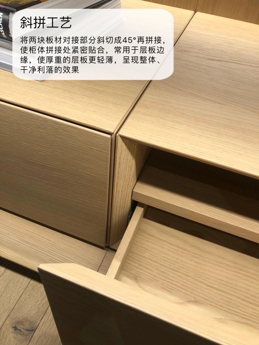 ??斜拼工藝 將兩塊板材對接部分斜切成45度再拼接,使柜體拼接處緊密貼合,常用于層板邊緣,使厚重的層板顯得更為輕薄,呈現整體流暢、干凈利落的效果。