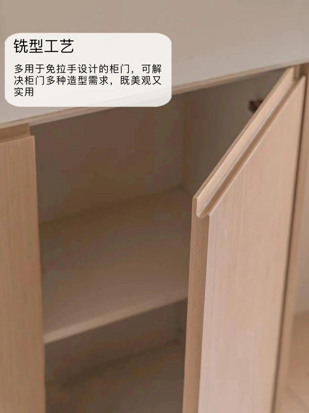 是一種板材的裁切方式,可以讓厚重的板子變更薄,一般配合免拉手的設計,用于門板邊緣,充當柜子、抽屜的拉手。