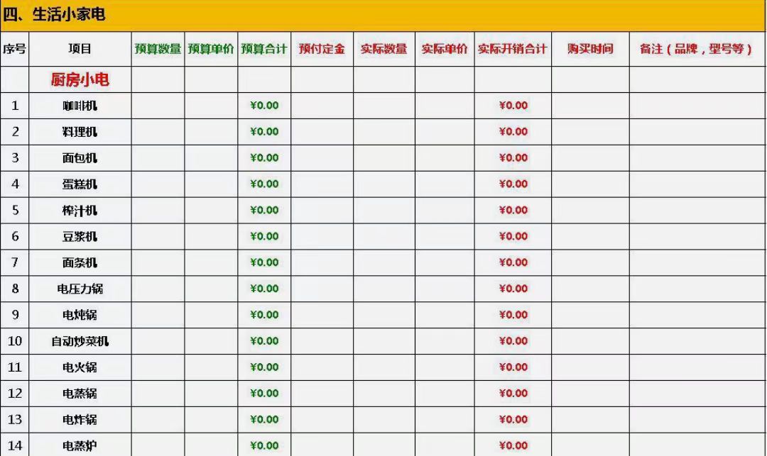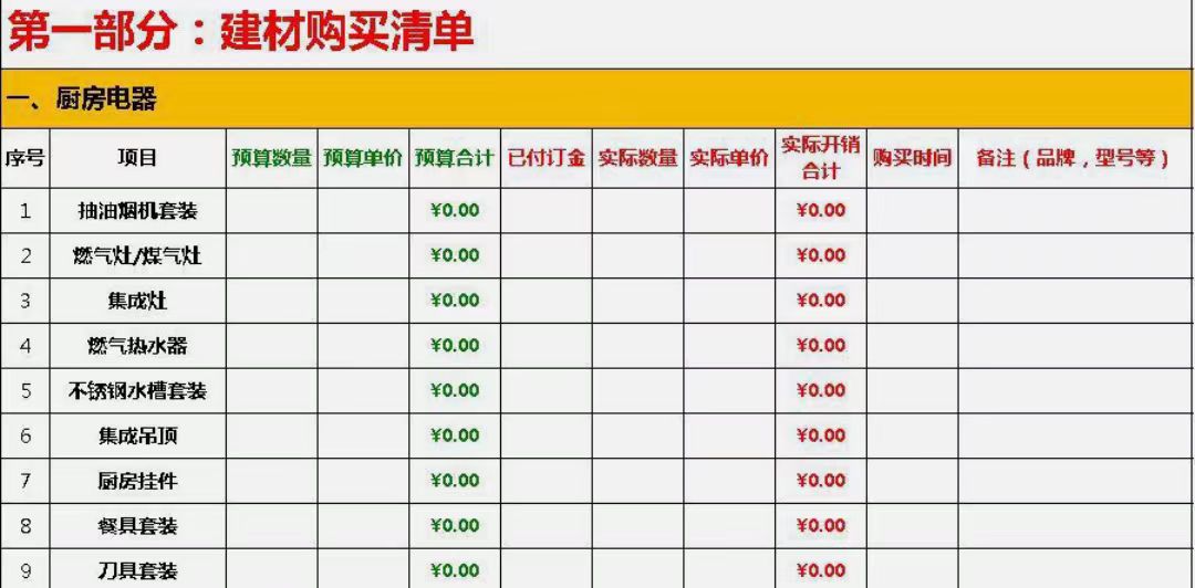 對了!除了需要知道上面裝修的基本流程外,裝修新手更需要一份新房裝修預算表!